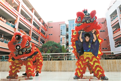 6月5日,在广州市第五中学,醒狮进校园为高三考生加油助威。广州日报全媒体记者陈忧子 摄