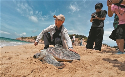 在“世界海龟日”的放流现场,200只神态呆萌的小海龟被工作人员运送到沙滩后,便开始奋力划动稚嫩的四肢,朝着大海爬行。此次放生的海龟共200只,均为保护区自然孵化,其中100只经过8个月的野化训练。