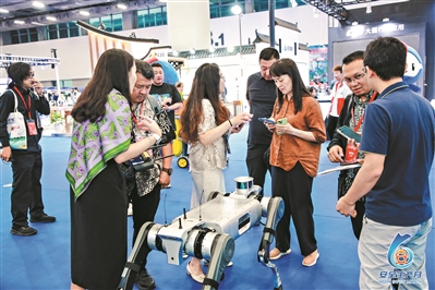 展区内的一只行动敏捷的机器狗,吸引游客围观。