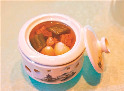 此外,该饭店推出的荔枝苦瓜炖排骨汤也备受好评。在广东,就要喝靓汤!将荔枝入菜,怎么少得了用荔枝煲汤!豪门大饭店这碗荔枝苦瓜炖排骨汤,与传统的苦瓜炖排骨汤相比,荔枝的加入为原本偏微苦的汤带来明显的果香甜味,苦瓜的苦与荔枝的甜在这里达到了巧妙的平衡,形成了甘甜的基调。