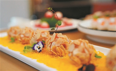 还有虎门富莱酒店杏香虾胶荔枝球,在一颗颗裹满金黄杏仁片的虾胶球下,是塞满芝士的一颗荔枝肉。奶香芝士、清甜荔枝、弹牙虾胶、香脆杏仁片在这颗杏香虾胶荔枝球上得到了完美呈现。