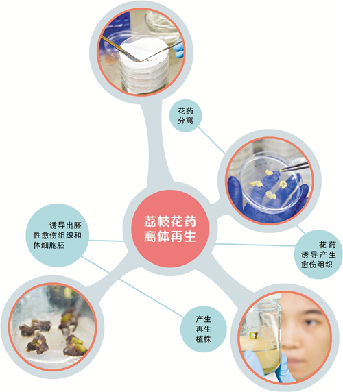 在国家瓜果改良中心荔枝分中心的实验室内,记者见到多位科研人员正在进行荔枝花药的分离,这些花药经过培养基一段时间的培养后,就会产生愈伤组织,进而诱导出胚性愈伤组织和体细胞胚,产生再生植株,建立荔枝组培再生体系。