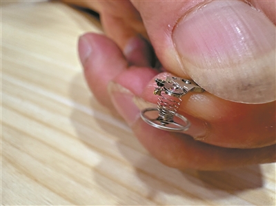 摆轮顶端有一个金属轴心,肉眼根本看不到。“手表一摔,很可能摔断轴心,一般的修理师傅只会换掉整个摆轮,但我们有一门绝技叫作‘种轴心’,不用换零件,自己磨‘轴心’接上去,这对找不到零配件替换的老款手表而言非常重要。”周建和说。摆轮里还有游丝,只有头发那么细,被盘成蚊香造型。“手表一摔,游丝就乱了,从而影响走时的准确度,我们能重新恢复游丝的规整,这是第二个‘绝技’。”他介绍道。