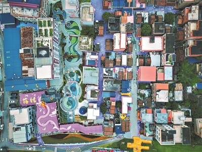 设计师结合“鱼”形村落形态特点,艺术化构造出“鱼头—鱼身—鱼肚”空间格局。“设计师以关王村为鱼头精心打造点睛锦鲤池,在鱼身、鱼肚部分运用‘锦鲤红’‘锦鲤黄’主色调,绘制七大锦鲤主题及特色文化墙绘,使建筑群化作鳞片形成似游鱼般的动态景观,既避免改造的孤立化、碎片化,又为村庄注入独特文化意蕴。”荷城街道相关负责人表示。当建筑群如游鱼般在11万平方米的立体画卷中摆动,这种将村落原生“鱼形”地貌与艺术改造深度绑定的手法,让文化不再是墙上的装饰,而成为流动的空间语言。