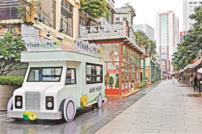 在潮楼和北京路天河城之间,一栋色彩明快的居民楼格外活泼,外墙上“I♥北京路”(我爱北京路)的大型标志成为新晋打卡点。设计团队说:“这原来是一栋灰色的居民楼,低沉的色调和步行街的商业氛围并不匹配。我们采用简单的手法进行改造,在外立面增加色彩的拼贴,而且不遮挡居民的窗户和阳台。”改造后,两大商业综合体之间的“断点”连起来了,步行街的暗区亮起来了。