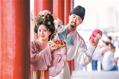 “杨贵妃”和“李白”将荔枝和吉祥物带上了西安城墙。 主办方供图