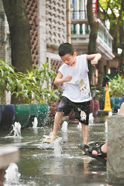 气温炎热,孩子在户外玩水很快乐。