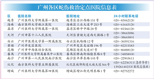 通过连续多日实地调研,市人大代表了解到,目前,广州已建立完善的蛇伤防治体系,蛇伤救治能力大大提升,比如,进一步规范蛇伤救治流程,定点医院配齐备足了抗蛇毒血清。