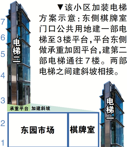 最终,第四次调整后形成了最终方案:从大楼东侧棋牌室门口公共用地选3平方米作为电梯井,架设一部电梯直上3楼;在3楼西侧下沉平台做一个约12平方米的承重加固平台,用以安装第二部通往7楼的电梯;在3楼平台架设一条约30米长的斜坡用以衔接两部电梯。