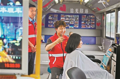 在生态园片区现场,一个特别的“摊位”格外瞩目,不少居民正在此排队。一辆停靠在党群服务中心门前的公交车被临时改造成便民理发店。车厢内,党员志愿者手中的剪刀上下翻飞,正为居民认真修剪头发。