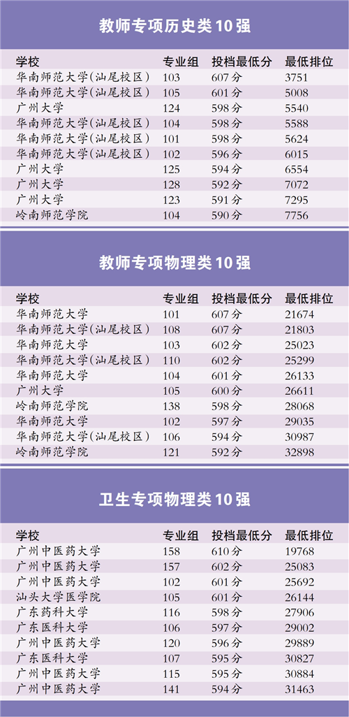 最低投档分方面,历史类10强中,华南师范大学(汕尾校区)表现强势,占据5席;广州大学占据4席,最后一席被岭南师范学院104专业组摘得。嘉应学院119专业组最低投档分540分,投档最低排位29810,为该批次历史类教师专项的最低分,超出本科线76分。