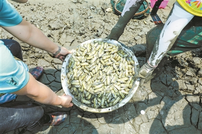 当然,蛏霸的养成除了有天时地利,人也是当中的关键。在每年的12月至翌年3月中旬,蛏农便开始忙碌地洗苗、撒苗。哆头蛏也钻进黑泥里,吸收滩涂里的营养。直到4~8月份的收获季节,蛏农就要走进深至膝盖的黑泥里,徒手将蛏子挖出,这是传承600年的技艺,亦是对黑泥滩涂的爱护。记者过去曾到访当地,蛏农曾说,看到黑泥里冒出两个小洞,马上伸出食指和中指,顺着这两个小孔往里面探,摸到硬硬的蛏壳就可以挖出来了。