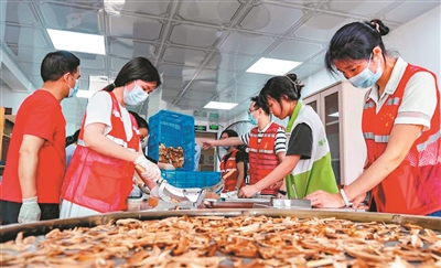 竹三村“菇友”在加工灵芝片。 广州日报全媒体记者庄小龙 通讯员王越平 摄