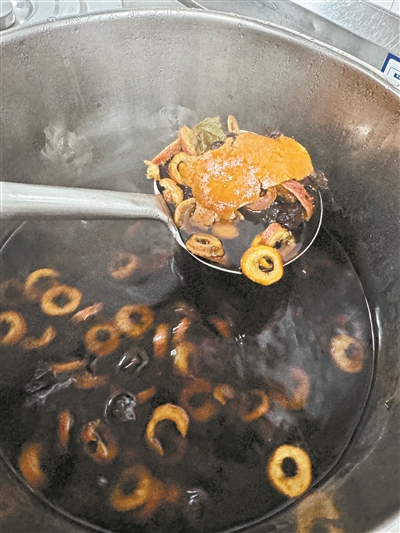 夏训期间,膳食科还在科研处运动营养学理论指导之下设计出多款消暑汤水,正餐组组长梁晓暾向记者展示了刚煮好的酸枣山楂陈皮水。酷暑难耐,大部分队伍都在室内训练场馆备战,广东田径队训练场地基本在室外,因此,膳食科每天中午煮好一大锅消暑汤水,等待田径队下午取走,运动员在训练之后就能喝上,立即暑气全消。