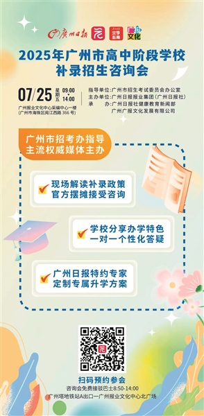 广州日报讯 (全媒体记者谢泽楷)根据广州市招考办发布的2025年广州市高中阶段学校录取工作日程安排表,今年的补录计划将于7月25日公布。就在补录计划公布的同一天,即7月25日9点至14点,2025年广州市高中阶段学校补录招生咨询会将在广州报业文化中心举办(地址:广州市海珠区阅江西路366号)。