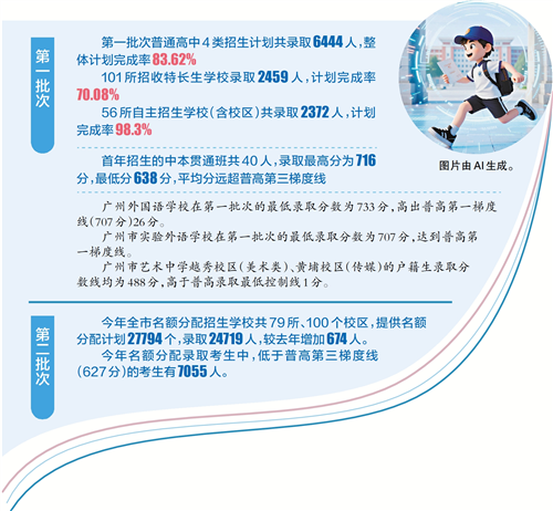 7月21日,2025年广州市中考第一批次和第二批次录取结束。记者从广州市招考办获悉,第一批次普通高中4类招生计划共录取6444人,整体计划完成率83.62%,较去年提高2个百分点。