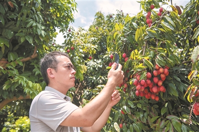 通过荔枝种质资源性状采集系统手机端,史发超拍照记录荔枝果实。