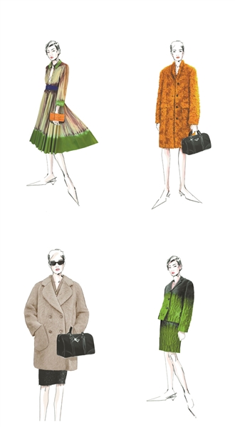 Prada为电视剧《繁花》中的角色打造的时装设计概念图。