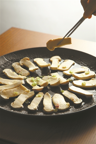 相比清雅派,豪迈吃法更显丰腴滋味。以油入松茸是本地的一大特色,梁家贤向记者介绍,鸡油可在煎的过程中将油润自然融入松茸中,而黄油煎松茸则是较为香口的吃法,其做法也并不繁复。他采用的新鲜松茸尺寸为7~9厘米,切成2厘米的厚片,平底锅加热放入黄油,再平整铺上松茸片,将其两面颜色煎至变深变黄,再撒入少许黑胡椒盐调味。以这种做法制成的松茸,香味充分激发,轻咬一口,滑嫩弹牙,还带着少许汁水。