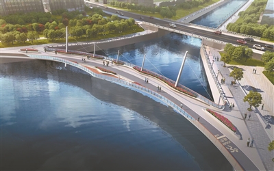 桥梁全长约96米,以“帆影流韵”为设计主题,将海上丝绸之路文化寓意和桥梁结构相融合,将帆船意象融入桥梁设计,塔柱与拉索形似帆船桅杆与缆绳,整体造型富有动感。桥面将设置3米宽步行道与2米宽跑步道,搭配休憩座椅、绿化花池等,满足不同群体需求,实现运动、通行与休闲功能的巧妙结合。