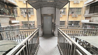 加装的电梯以电梯间为中心,增设三条分别连接三栋大楼的廊桥。