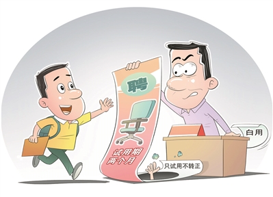 只试用不转正?试用变成了“白用”?据报道,某些企业存在“试用期合同”替代劳动合同、“模糊”试用期期限、变相延长试用期等规避劳动关系的违法行为。试用期本是雇佣双方的考察期、磨合期,却成了一些无良企业为节省用人成本而侵害劳动者权益的“挡箭牌”。对此,必须完善监管机制,加大打击力度,清除权益保护的死角、盲区,降低劳动者维权成本,更好营造法治化用工环境。不让试用期沦为“廉价期”“白用期”乃至劳动者权益保护的“真空期”,也是构建和谐劳动关系的题中之义。 (吴夕)