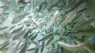 饶平县万佳水产有限公司的工厂化循环水养殖车间内,一群群花鲈鱼苗如银色闪电般穿梭游弋。