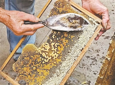 黄叔抽出蜜脾,沉甸甸的蜂蜜让他露出满意的笑容,据介绍,一块蜜脾重达3斤。只见他手持刀具,轻轻一割,黄澄澄、亮晶晶的蜂蜜展露无遗,蜂蜜的馥郁香气瞬间飘散开来,沁人心脾。