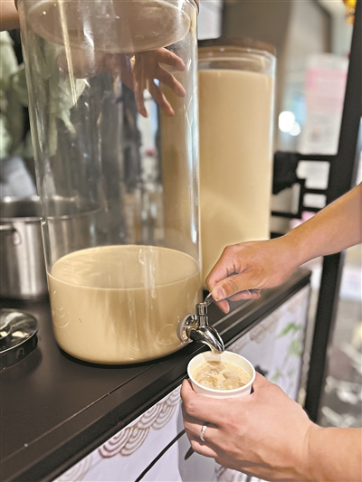 与会者尝试加冰的中药奶茶。