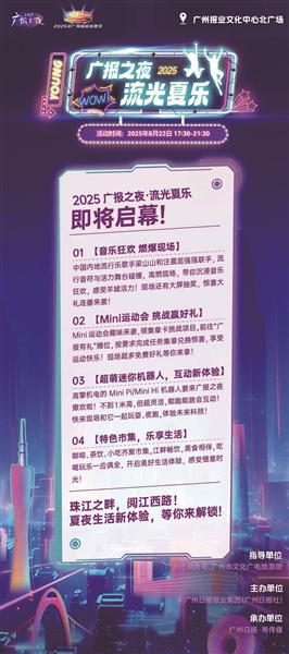 广州日报讯 (全媒体记者曾繁莹)珠江潮涌,华灯初上,羊城夏夜的画卷正徐徐展开。今年,恰逢“十五运”与广州相遇,紧扣人工智能的时代脉搏,在广州市商务局和广州市文化广电旅游局指导下,由广州日报报业集团(广州日报社)主办的2025“广报之夜·流光夏乐”活动将融合体育精神、人工智能互动与夜间消费,于8月22日17:30~21:30,在广报中心北广场活力绽放。诚邀您共赴这场活力、智慧与美好的夏夜盛宴。