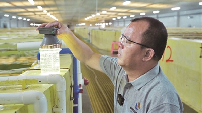 颜阔秋在检查鱼卵的健康状态。