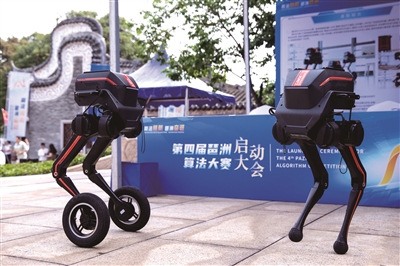 全球首个“空地”一体化协同AI竞技赛在广州海珠国家湿地公园举办,这是活动现场展示的具身智能机器人。