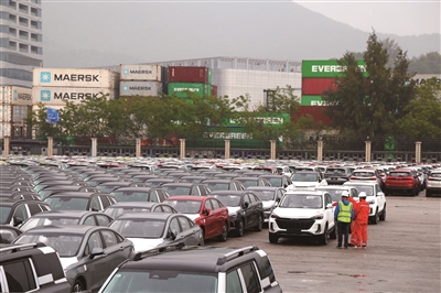 在深圳盐田港,查验人员检查即将出口的汽车。 新华社发