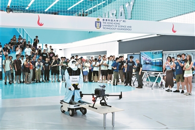 8月13日,港科大(广州)校园内处处可见中外学子热烈交流的场景。在Highbay空间内,阶梯上坐满学生,他们目不转睛地围观无人机精准起降,在惊叹声中纷纷举起手机拍摄记录,并与教授积极互动。融合AI艺术创作与大空间扩展现实(XR)的艺术展览、智能自动驾驶技术中心、先进的3D建模车间……这些前沿科技场景,让营员们得以沉浸式体验广州“新质生产力”。