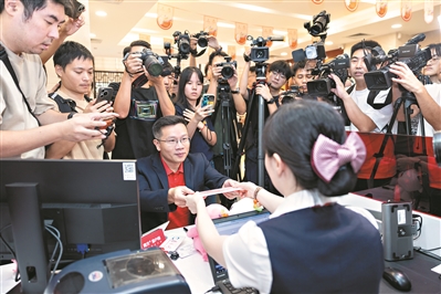 中国工商银行门票线下销售网点,工作人员为首批购票者递上门票。广州日报全媒体记者苏俊杰摄