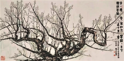 赖少其作品《风送十里香》也是艺术家难得一见的珍贵作品。赖少其一生画大尺寸山水很多,但大尺寸墨梅,赖少其一生仅作两件,此作为其中一件。《风送十里香》中,梅花枝条瘦而劲挺,主干梅枝弯曲向上;再用工笔勾勒出梅花朵朵。梅干的曲屈劲健、发枝的繁而不乱以及严谨的构图均显示了画家扎实的造型功底。作品整体与细节兼顾,诗、书、画相得益彰;远观气势磅礴,近看主干细部,处处如一张张精致的小幅山水画,亦是此画作精彩绝妙之处。