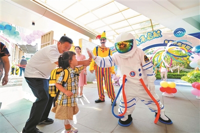 一大早,南城阳光第五幼儿园的老师们穿着奇妙的宇航员服装,在校门口等待孩子的到来。陆续步入幼儿园的孩子和家长在心愿驿站打卡,写下新学期的期待和希望,整个过程充满了趣味性与仪式感。老师们一个温暖的拥抱、一句亲切的问候,缓解了孩子们与父母分别时的紧张情绪。萌娃们在欢声笑语中开启新的旅程。