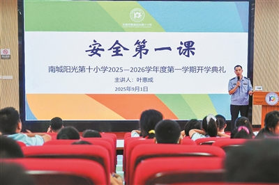 在开学典礼上,南城阳光第十小学的法治副校长为孩子们带来生动的普法教育课。
