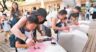 在大朗镇新民小学,家长与学童一起书写简单而有意义的“人”字。广州日报全媒体记者马骏 通讯员荔香摄