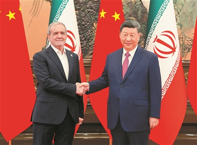 习近平指出,中伊关系经受住国际风云变幻考验,保持平稳健康发展。去年我们在喀山会晤后,两国各部门积极落实双方达成的重要共识,中伊各领域合作取得不少新成果。中方始终把发展对伊关系置于中国中东外交重要位置,愿同伊方赓续友好,深化互信,加强在贸易、投资、清洁能源、互联互通等领域合作,增进人文交往,携手推动中伊全面战略伙伴关系行稳致远。中方提出全球治理倡议,愿同包括伊朗在内的国际社会一道,推动构建更加公正合理的全球治理体系,携手构建人类命运共同体。