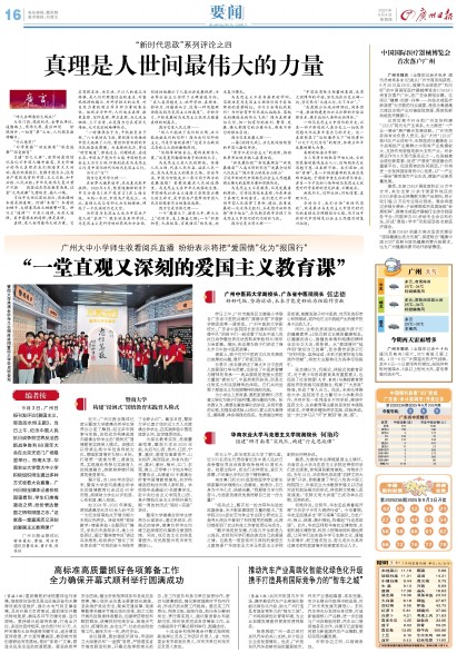 9月3日,广州日报刊发评论《爱国主义,思政的永恒主题》。当日上午,纪念中国人民抗日战争暨世界反法西斯战争胜利80周年大会在北京天安门广场隆重举行。暨南大学、华南农业大学等大中小学积极组织师生通过多种方式收看大会直播。广州日报全媒体记者在校园里看到,学生们难掩激动之情,纷纷表达爱国之情和报国之志,“这就是一堂直观而又深刻的爱国主义教育课!”
