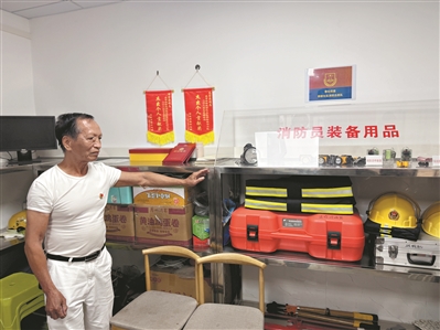 老党员邓金源展示小区的消防和应急设施。