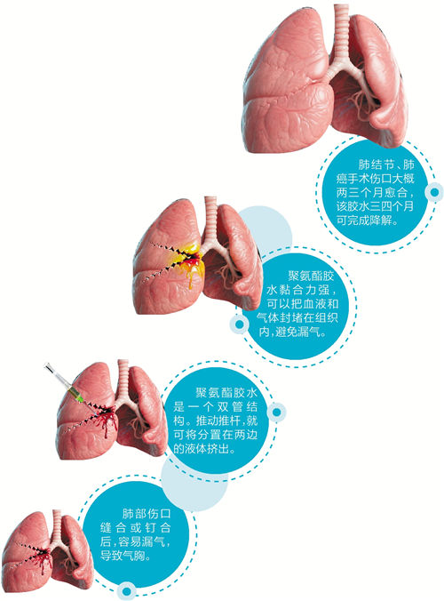 据介绍,在我国,肺癌发病率在所有肿瘤中居首位,很多肺癌患者需要手术治疗。肿瘤切除后,一般要进行缝合或钉合,但就算缝或钉得再牢,仍会出现漏气。根据《新英格兰医学杂志》的报道,部分肺癌患者手术出院后不久便死亡,大部分死因不是手术问题,而是突发气胸,来不及抢救。