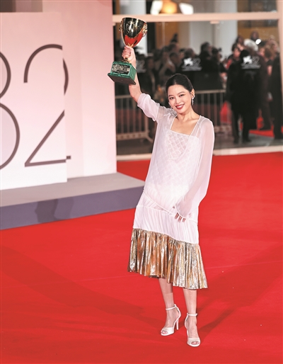 9月6日,在意大利威尼斯,辛芷蕾夺得第82届威尼斯电影节最佳女演员奖。 新华社发