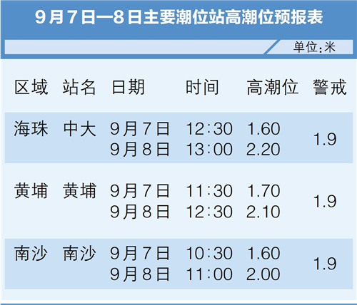 9月8日中午前后潮位较高,请珠江沿岸亲水平台等低洼地段社会公众及时做好防御及避险工作;需防范台风带来的强降水遭遇风暴潮顶托引起的低洼地区的城市内涝灾害,提前做好水闸调度;请密切关注台风动向,并留意最新的预警预报。