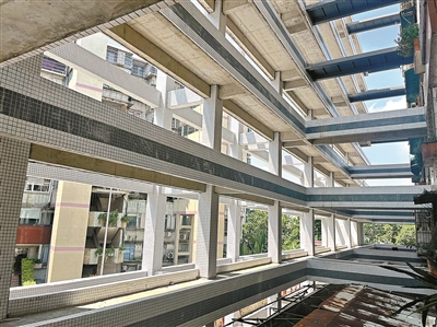 某小区的电梯连廊已建好,但栏杆仍未安装,整个工程已停工多时。