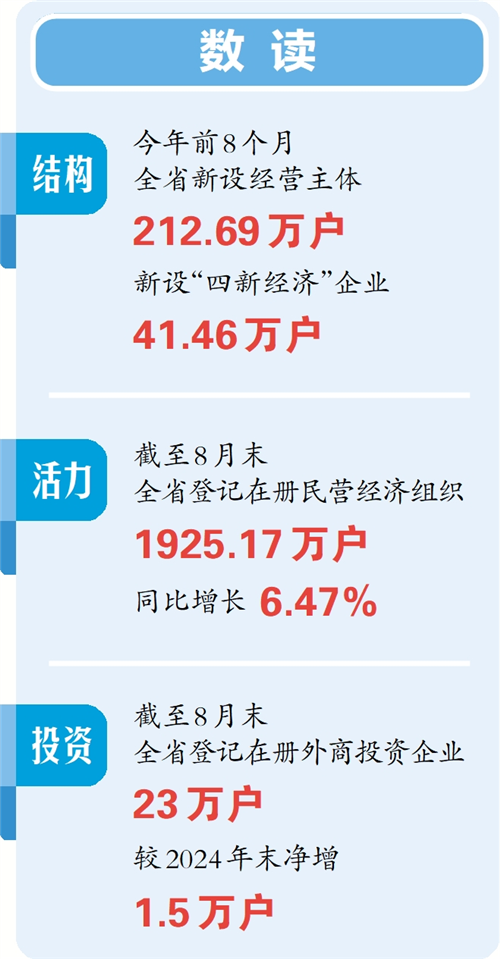 经营主体规模结构优化。广东以改革攻坚持续优化市场准入环境,全面推行“高效办成一件事”,实现企业开办“一网通办、一天办结”,市场准入更加便捷高效。今年前8个月,全省新设经营主体212.69万户,注销经营主体114.16万户,新设注销比为1.86:1。全省新设“四新经济”(新技术、新产业、新业态、新模式)企业41.46万户,占全省新设企业总量37.92%,新设“数字经济”企业16.76万户,同比大幅增长25.41%,有力支撑新质生产力发展。在提升准入效率的同时,更加注重发展秩序与安全,通过加强经营主体实名认证、开展市场准入壁垒清理行动,有效防范经营主体虚增风险,1000万元以下规模的新设公司占比达98%,经营主体结构更趋合理。全省企业、个体工商户平均寿命分别为5.24年和6.01年,较去年同期分别延长0.09年和0.4年,经营主体发展韧性持续增强。