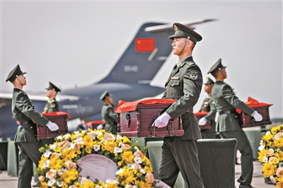9月12日,第十二批在韩中国人民志愿军烈士遗骸回国。礼兵将殓放志愿军烈士遗骸的棺椁从棺椁摆放区护送上车。 新华社发