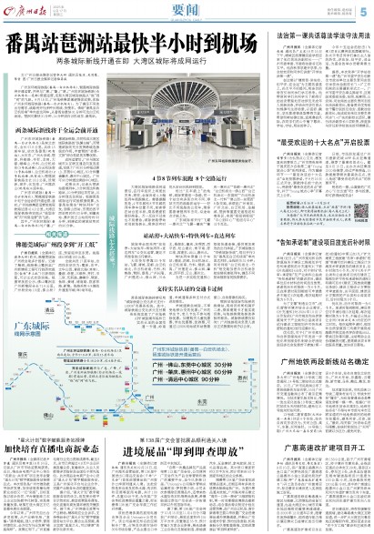 试乘当天,记者从琶洲站搭乘列车,3分钟到达科韵路站,10分钟到达岑村站,16分钟到达龙洞站。根据两条城际运行试验数据测算,从番禺站乘坐“特快列车”出发,到佛山西站、东莞的西平西站用时约20分钟,到肇庆站、惠州的云山站用时约60分钟,到清远的清城站用时约90分钟。