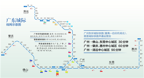 成网运营后,广州与湾区城市从互联互通走向直连直通,实现了广州30分钟抵达佛山、东莞中心城区,60分钟覆盖肇庆、惠州中心城区。广州可90分钟通达清远中心城区。